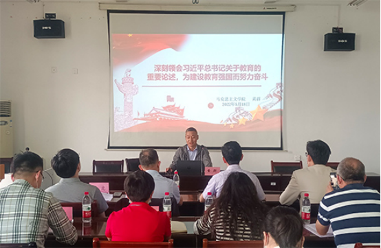 会议强调,习近平总书记关于教育的重要论述,系统回答了一系列方向性、全局性、战略性重大问题,为新时代中国特色社会主义教育提供了根本遵循。一要善学深思,进一步深入学习贯彻习近平总书记关于教育的重要论述,不断增强“四个意识”、坚定“四个自信”、做到“两个维护”,自觉把思想和行动统一到党中央对教育改革发展的新要求新任务上来,落实立德树人根本任务,深化教育改革,加快推进教育现代化,努力培养德智体美劳全面发展的社会主义建设者和接班人。二要联系“教育思想大讨论”持续深入学,全面贯彻党的教育方针,紧盯加快教育现代化、建设教育强国、办好人民满意教育的目标,不断增强守初心、担使命、讲奉献、比贡献的时代责任感和使命感,推进学院“十四五”规划,以实际行动迎接党的二十大胜利召开。