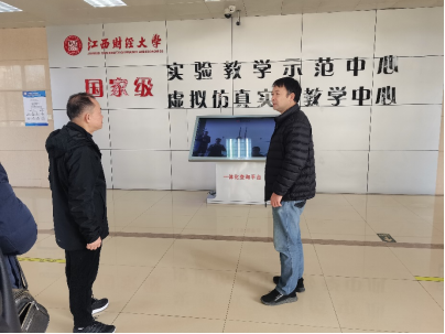 在江西财经大学,软件与物联网工程公司党委书记季小刚、副经理汪靖热情接待了邓经理一行并举行了座谈会,在座谈交流会上双方就本学院整体发展情况、实验室建设等方面进行了深入交流。邓经理一行参观了软件与物联网工程学院实验室以及江西财经大学国家级虚拟仿真实验教学示范中心。
