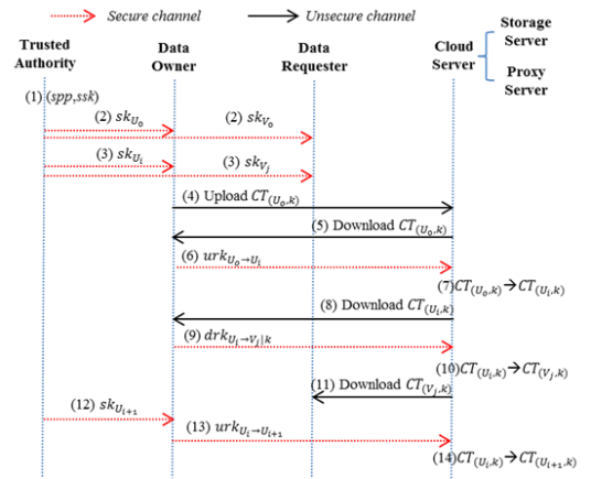 此项项目研究首次提出了一种同时支持多次密文进化变换和单次密文条件授权变换的基于身份的代理重加密方案。研究人员通过修改一个单跳基于身份的条件代理重加密方案和另外一个多跳基于身份的条件代理重加密方案以满足融合需求,其中前者被用于实现授权,密文变换仅允许被执行一次;而后者用于用户密钥发生变化后密文的同步进化,其允许被执行多次。方案不仅同时解决了密文需要多次变换和限制单次变换的矛盾,还同时满足抵抗选择密文攻击,即允许对密文进行合法的变换又不允许对密文非法篡改。另外,方案还可以抵抗串谋攻击,即使知道授权者老(过期的或泄露的)密钥的敌手和知道更新令牌的代理勾结也不能推导出授权者新的密钥;即使被授权者和知道授权令牌的代理勾结也不能推导出授权者的密钥;即使知道授权者老的密钥、更新令牌、老授权令牌和被授权者的密钥也不能推导出新的授权令牌。与同类方案相比,该方案在安全性方面获得了改进,与两个底层方案相比,在计算和存储等方面开销更小。