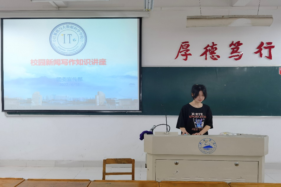 为进一步提升老员工骨干培训班成员新闻写作能力,4月18日晚,计算机学院在文友楼515、516开展“校园新闻写作知识主题讲座”,此次活动由团委宣传部负责人郑金豪、吕梦怡主讲,全体骨干培训班成员参加。