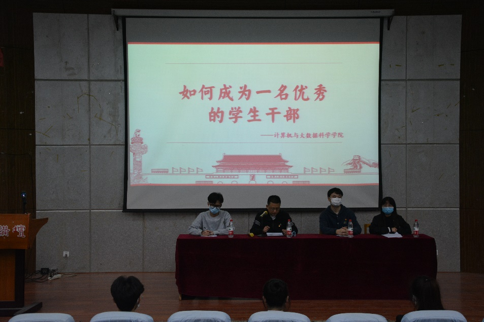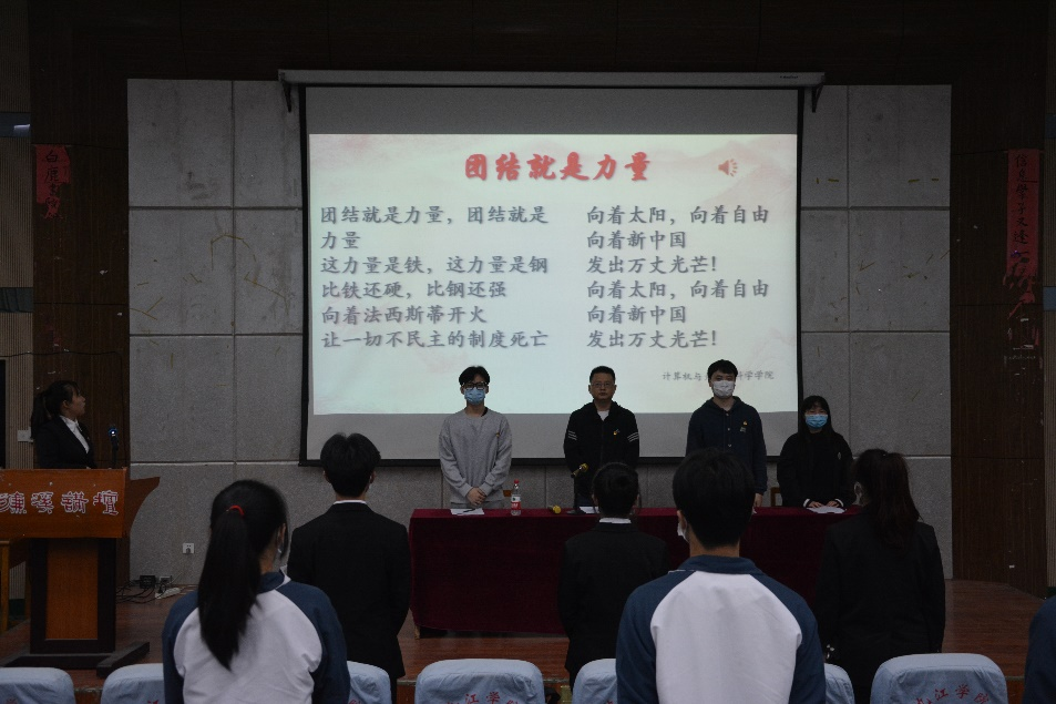 4月14日晚,计算机学院采取线上与线下结合的方式举行2021级骨干培训班开班仪式,主会场安排在文友楼报告厅,分会场为文友楼515、516。此次开班仪式出席人员有:计算机学院思政科副科长尹志刚、20届团委员工会干部、21级骨干班全体成员,活动由团委办公室主任孙文芳主持。