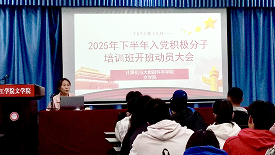为深入学习贯彻习近平新时代中国特色社会主义思想和党的二十大精神,切实加强入党积极分子思想政治引领,严把党员发展“入口关”,10月20日下午,文学院、计算机公司党委分党校联合举办的2025年下半年入党积极分子培训班开班动员大会在文友楼204召开。文学院组织员余蓓老师、计算机学院组织员周波老师出席大会,两院60余名参训入党积极分子参会。