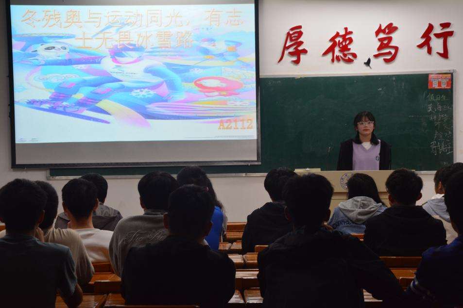 活动中,各班团支书通过PPT的演示以及冬残奥会的比赛视频来带领同学们感受残奥会的精神和领略我国运动员的风采,深入体会残奥会比赛氛围。残奥会比拼的,是人类最坚韧的灵魂,赛场上无数个感人瞬间,带给同学们震撼和触动。