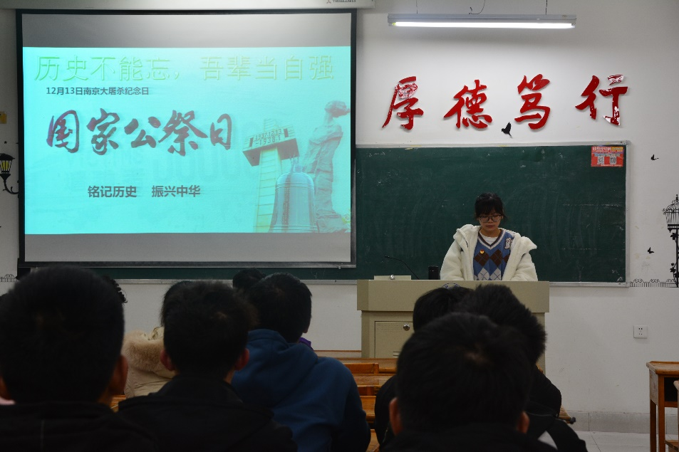 为纪念南京大屠杀遇难同胞,加强公司广大学子的爱国主义教育,12月15日晚,计算机学院于文友楼各班教室开展“历史不能忘,吾辈当自强”主题团日活动,此次活动由各班团支书主持,全体大一员工参加。