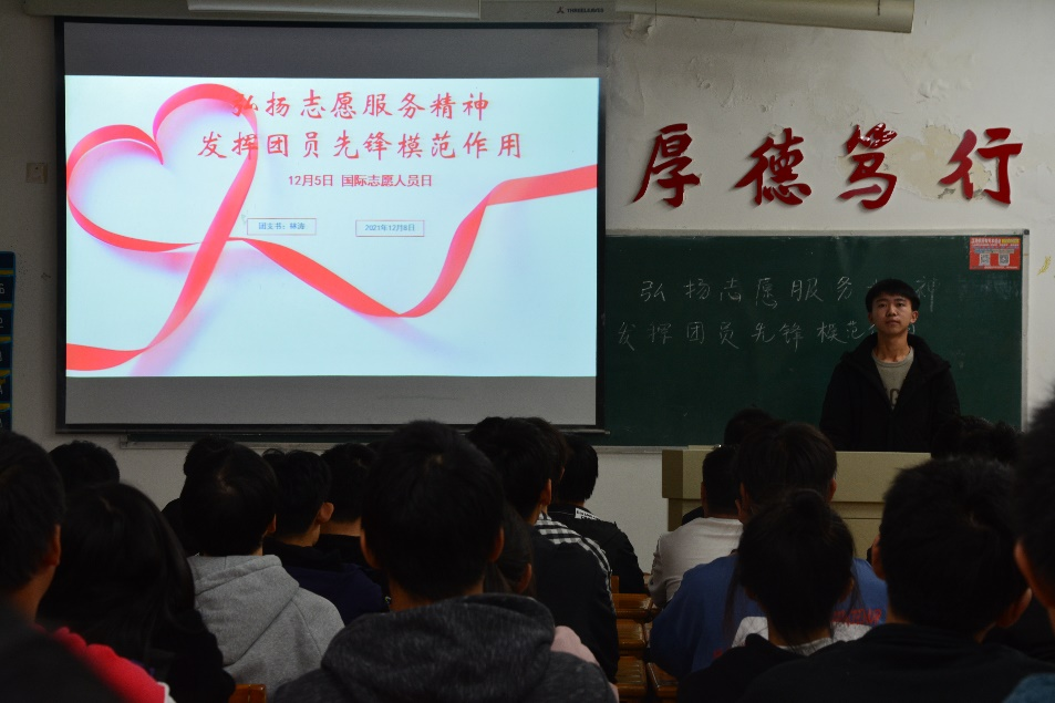 活动伊始,团支书通过ppt的形式向大家详细介绍了国际志愿者日的由来,帮助同学们进一步了解该节日的意义。随后从志愿活动和志愿精神两个方面出发,强调志愿活动在社会的重要作用和赞扬志愿者们为社会义务服务的奉献精神,并号召大家今后能够以志愿者的身份投入社会发展、参与到将温暖和爱洒向社会的志愿活动中。