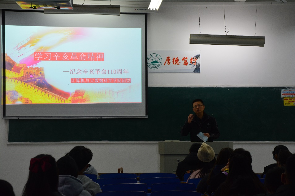 为纪念辛亥革命110周年,弘扬红色文化,提高同学们爱国主义意识,11月10日,计算机学院于文友楼118开展“学习辛亥革命精神”主题讲座,此次讲座由思政教育科副科长尹志刚主讲,计算机学院全体团支书参加。