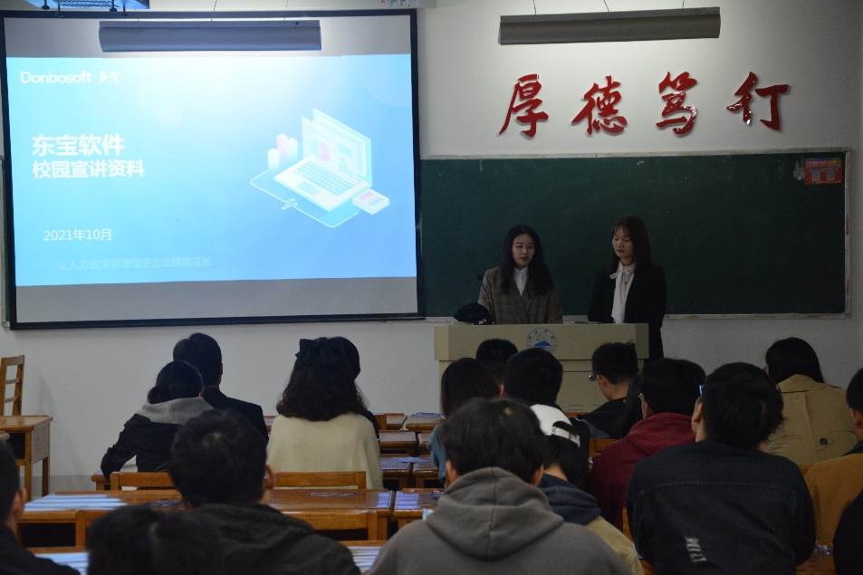 接着深圳市东宝信息技术有限公司的两位代表进行宣讲,他们从应届毕业生面临的挑战、该如何破局、如何突破自我到公司承担的社会责任以及未来的发展愿景五个方面展开叙述,全面而系统的解决了同学们的相关就业问题,同时对公司的基本状况进行了介绍,并提及了专业要求,发展机遇以及薪资待遇的问题,大大提高了同学们的兴趣。在宣讲过程中,同学们听的一丝不苟,并时不时的记一些笔记。最后在提问环节,同学们积极与公司代表进行交流,并且有部分同学还提交了自己的个人简历。