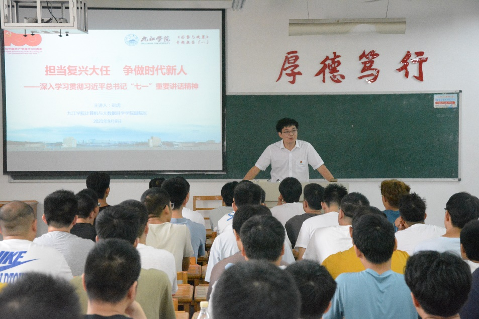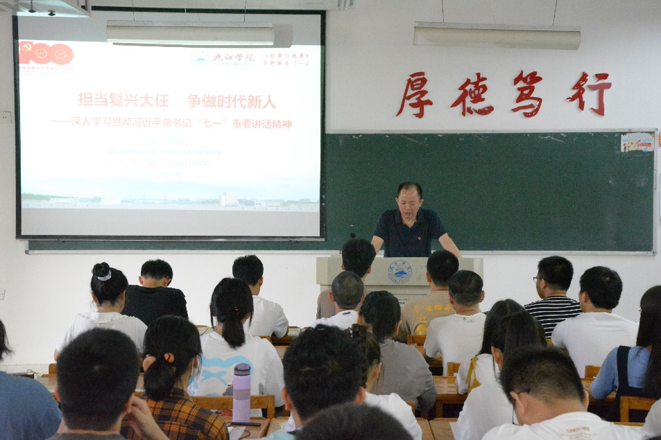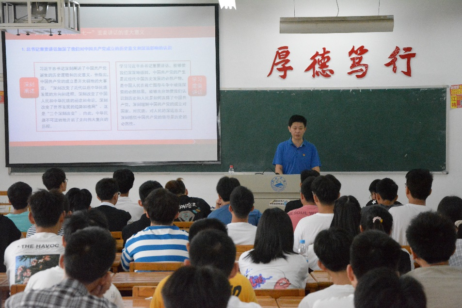课上,学院领导围绕学习贯彻习近平总书记“七一”重要讲话精神,以“担当复兴大任,争做时代新人”为主题进行授课。院领导旁征博引,以历史为纵线,向同学们阐述中华民族从“任人宰割、饱受欺凌的时代一去不复返”到“进入了不可逆转的历史进程”,带领同学们学习了中国共产党百年征程的奋斗经验,加深了同学们对全面建成小康社会、顺利实现第一个百年奋斗目标的认识,并使同学们将中国共产党成立的历史意义和深远影响牢记在心,让每一位同学能够知党爱党,立志在实现中华民族伟大复兴中国梦的伟大实践中创造属于自己的精彩人生。