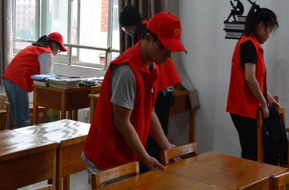 中午十二点十分,入党积极分子穿着红马甲,戴着小红帽,准时到达考研教室,开始了志愿活动。为了不影响正在学习的同学们,他们的动作轻巧又迅速,所到之处,桌面地面都恢复了干净整洁,让整个教室环境都变得令人愉悦起来。在分工安排之下,有的扫地、有的擦桌子、有的摆弄桌椅,整个过程井然有序,获得了同学们一致好评。