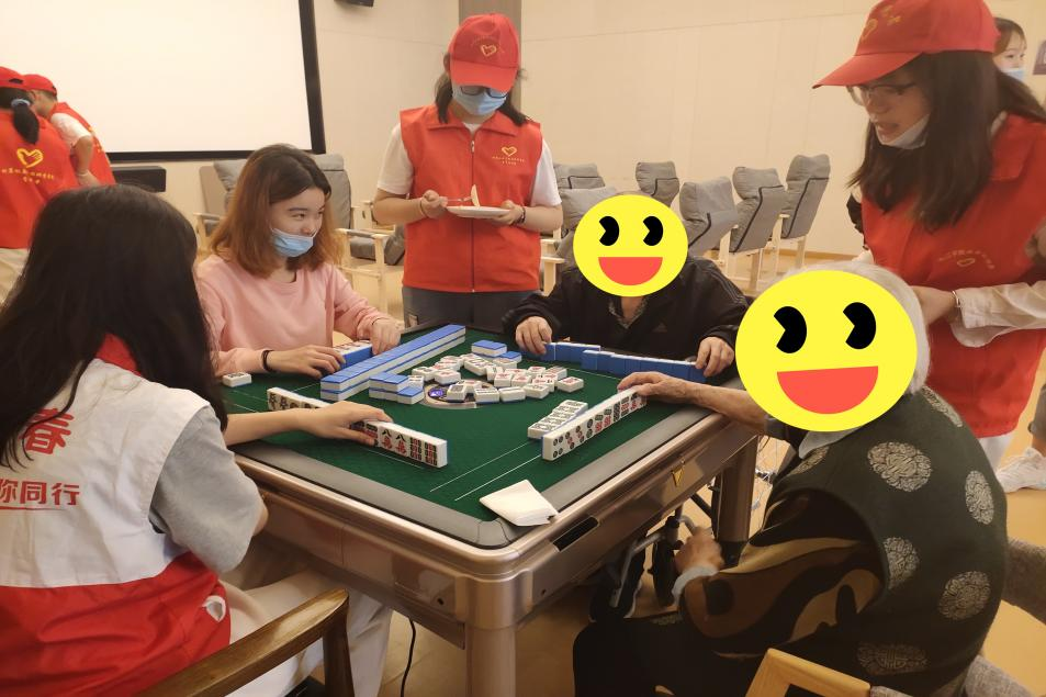 雨声绵绵,志愿者们撑着伞在雨中前行,在经历了半个小时的行程后,到达了七筑养老服务中心。志愿者轻车熟路地走到老人们的身旁,陪他们聊天、喂他们吃水果、陪他们娱乐,有的打麻将、有的下象棋、有的看抗战片,一片充实和谐。