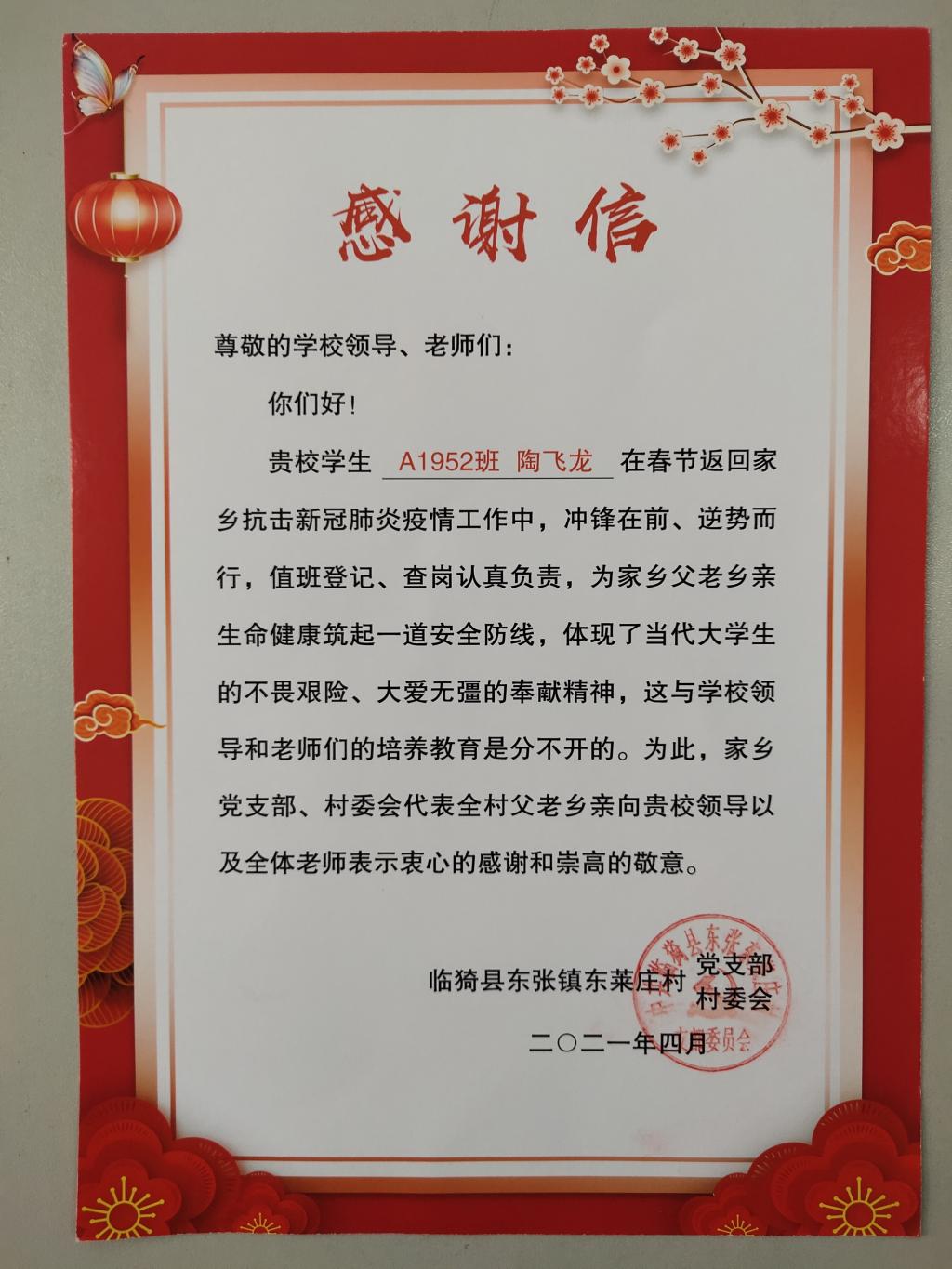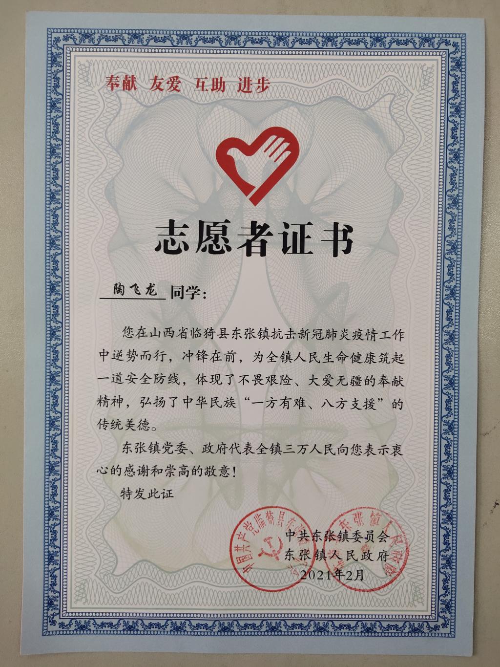 正是因为有他们在抗击新冠肺炎疫情工作中逆势而行,冲锋在前行,为家乡父老乡亲生命健康筑起一道安全防线,充分体现出当代老员工的不畏艰险、大爱无疆的奉献精神。中共东张镇委员会东张镇人民政府以及临猗县东张镇东莱庄村特向陶飞龙同学赠予感谢信和志愿者证书。
