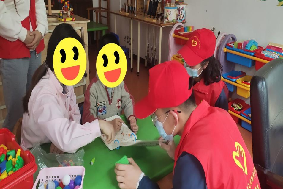 在出发之前,队员们提前了解孩子们的日常作息安排,并提前准备好了几个红色小故事,党史科普视频等,有雷锋的《我叫解放军》、有抗日英雄王二小的《歌唱王二小放牛郎》、还有海娃的《鸡毛信》等等。为了跟孩子们拉近距离,志愿者给他们讲故事、陪他们画画、玩玩具,进行一些户外活动等,并配合医师们和他们做康复训练。这是一群特殊的小天使,他们大多无法与我们正常对话,甚至连一些简单的互动都难以开展,但因为志愿者们的耐心和爱心,孩子们也放下戒备打开了心扉。
