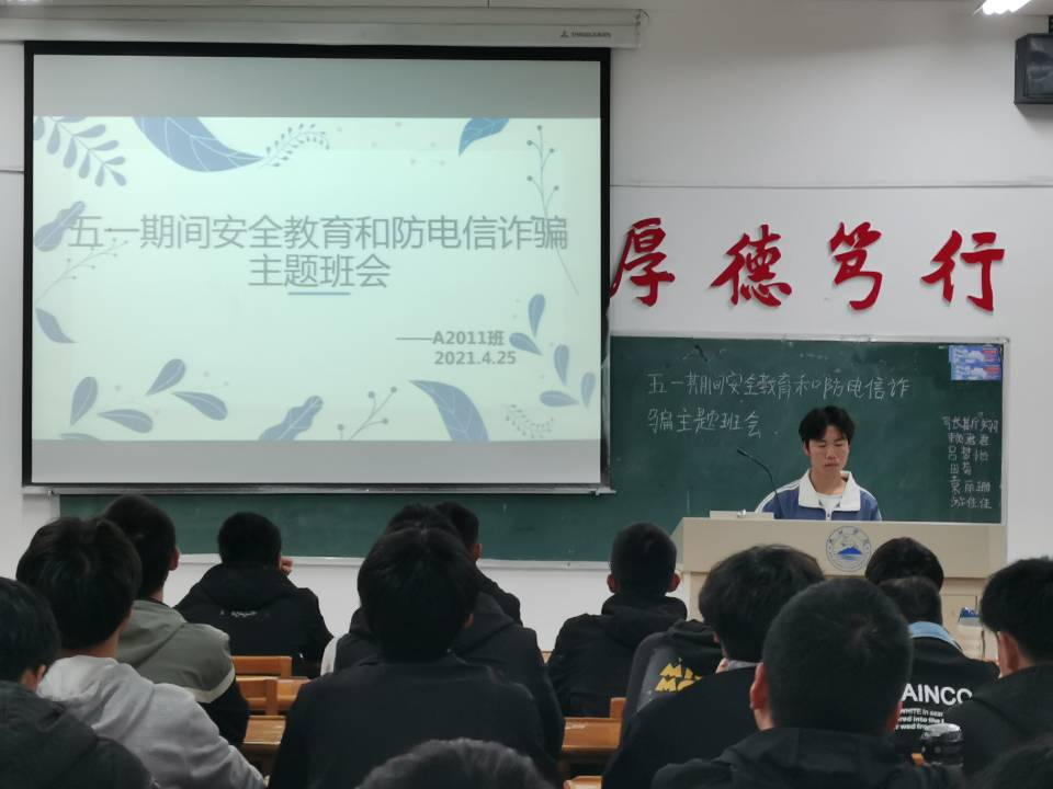 月落日升,星移斗转,就在这新的一年的流淌中,不知不觉,我们迎来了五一黄金假期。由于疫情依旧凶险,加上近期各种诈骗手段层出不穷,为了让同学们能度过一个安全愉快的假期,4月25日晚,计算机学院在文友楼各班开展“五一假期安全教育”及“防电信网络诈骗”主题班会。活动由各班班主任主持,全体员工参加。