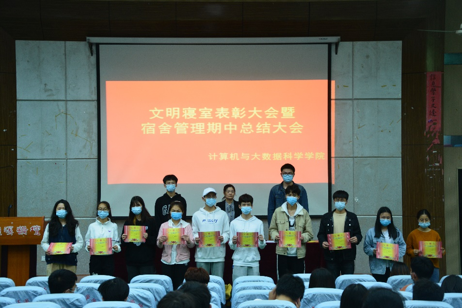 随后,班级管理部主任章子鹏带领大家一起学习《计算机学与大数据科学学院宿舍管理规定》,熊宇宣布此次获得表彰的文明寝室。最后,钟林飞为文明寝室代表颁奖,并合影留念。