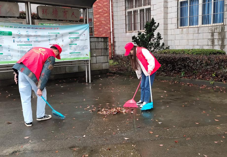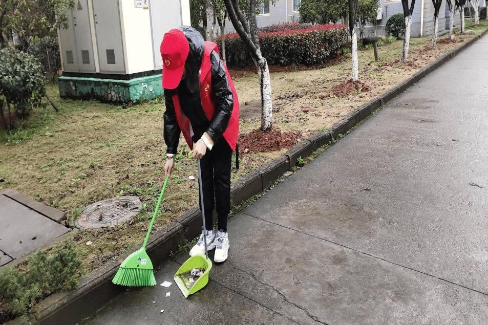 志愿者们认真地清理文友楼和楼栋周边各个角落的垃圾,树底下的树叶,还有门口长凳上粘贴的广告,并把违规停放的电动车、自行车停放到合理位置等。活动结束后,志愿者们组织了拍照,并把从教室借来的打扫工具放回了原位。