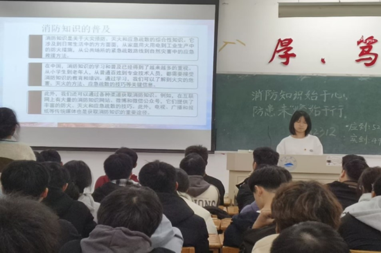活动在激昂的团歌中拉开帷幕。首先,各班同学观看了消防科普知识视频,详细了解了火灾是如何发生的,认识到安全防范从细节做起,防患于未然。之后,在消防知识问答环节中,同学纷纷举手抢答,活跃的氛围中不知不觉巩固并检验了对消防知识的掌握情况。活动最后,全体同学共同观看119消防宣传视频,大家看到消防战士的英勇与无畏,敬畏之情油然而生。