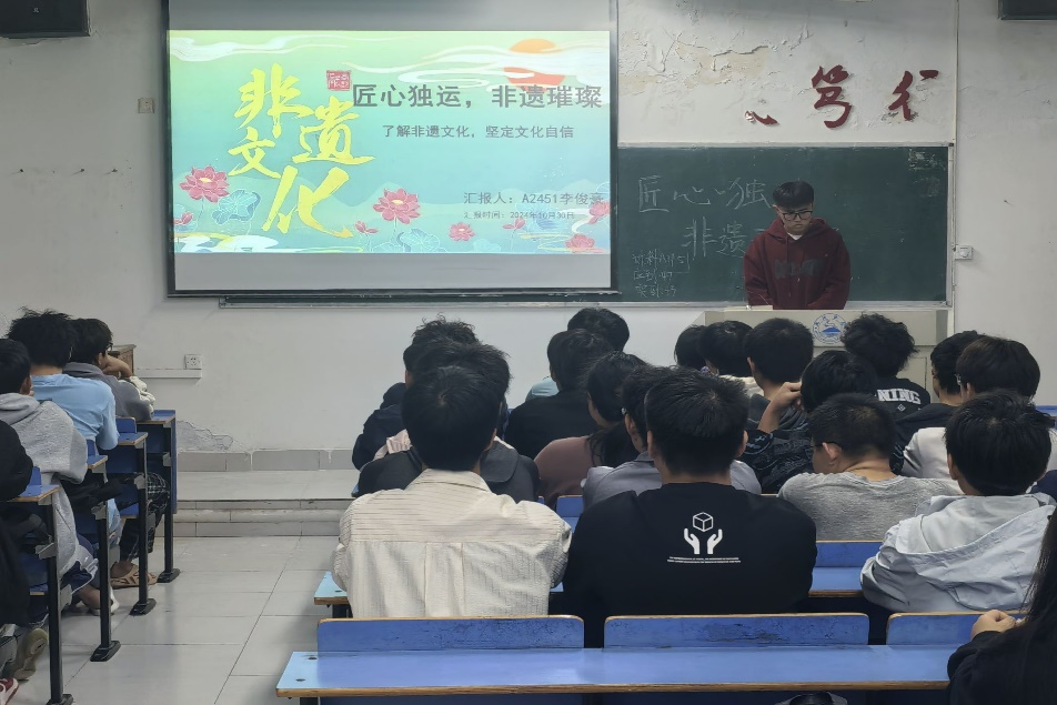 活动伊始,团支书通过PPT向同学们介绍了非物质文化遗产的定义、分类以及保护非遗的重要性。随后,通过一系列精美的图片和视频,同学们得以一窥剪纸、中国结、昆曲、秦腔等非遗项目的风采。这些活灵活现的展示,不仅让同学们感受到了非遗的魅力,也让他们对非遗的保护和传承有了更深刻的认识。
