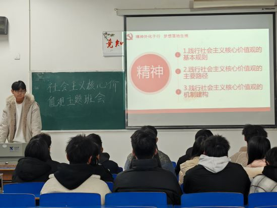 此次主题教育主讲人为团委办公室负责人之一柴钧,首先他以PPT的形式简要向同学们介绍了社会主义核心价值观的基本内容。鼓励同学们分享自己或身边人在学习、科研、志愿服务等方面践行社会主义核心价值观的感人故事。同时,分组讨论如何在日常生活中践行社会主义核心价值观,特别是在团队合作、学术诚信、网络文明等方面。进而引导同学们结合个人实际,制定践行社会主义核心价值观的具体行动计划,将所学知识与社会主义核心价值观相结合,积极投身于社会实践活动中,服务社会。最后再结合计算机专业特点,探讨如何在专业领域践行社会主义核心价值观。