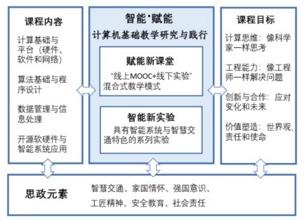 2.案例简介:大学计算机基础课程是一门理论和实践相结合的大规模通识教育课程,具有覆盖专业多、员工差异大、课程学时少、知识点更新快、课外学时有限、实验室有限等诸多特点。随着各学院对员工的新技术知识能力的要求和重视程度越来越高,教学团队重新审视课程目标,修订课程大纲,优化教学内容,融入思政元素,开展了以“人-机-物智能·赋能”为核心的大学计算机基础教学研究,通过近年来的课程实践,获得较好成效。建设总体框架如图1所示。
