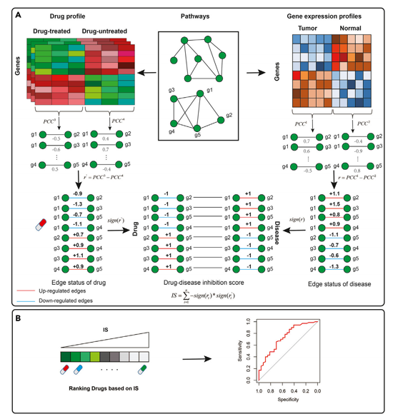 药物重定位是一种寻找已获批药物新治疗适应症的有效策略。目前,许多基于基因或通路层面的计算方法被提出以优先筛选抗癌候选药物。然而,这些方法忽视了基因间相互作用的变化。为突破这一局限,我们开发了一种基于边信息和通路拓扑结构的计算药物重定位方法(iEdgePathDDA)。首先,我们利用皮尔逊相关系数识别通路内药物诱导的基因互作边变化(drug-induced edges)和疾病相关的基因互作边变化(disease-related edges);其次,通过计算药物诱导边与疾病相关边间的抑制分数(inhibition score);最终依据所有疾病相关边的抑制得分对候选药物进行优先排序。案例研究表明,本方法基于CTD数据库成功识别了新的药物-疾病关联对。与现有方法相比,在结直肠癌、乳腺癌和肺癌数据集上,我们的方法在五项评价指标中均展现出更优越的性能。。