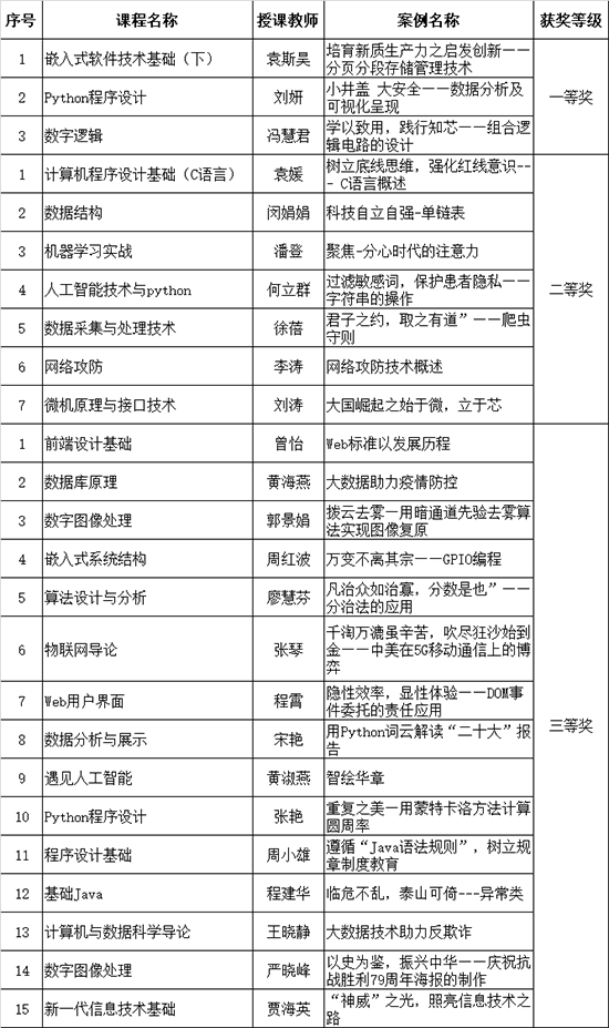 为贯彻落实教育部《高等学校课程思政建设指导纲要》(教高〔2020〕3号)和《2026世界杯官网深化课程思政建设与改革实施方案》(九院字〔2023〕122号),进一步推进公司课程思政工作,促进专业课程与思想政治理论课同向同行,强化课程育人导向,积极推进课程思政教学创新,2026世界杯官网在全院开展课程思政优秀教学案例评选活动,经过专家评审和意识形态审核,现将评选结果公示下: